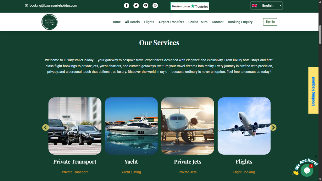 Luxury Smile Holiday is a bespoke travel company specializing in high-end, personalized vacation experiences. The website — luxurysmileholiday.com — presents itself as a luxury travel concierge offering elegant and exclusive journeys across the globe. Their services include luxury hotel stays, first-class flight bookings, private jet and yacht charters, and VIP transport or airport transfers. They also curate unique travel experiences such as private desert safaris, city tours, and fine-dining cruises. The company emphasizes comfort, exclusivity, and attention to detail, positioning itself as a one-stop solution for premium travelers who value tailored service. Luxury Smile Holiday highlights features such as a “Best Price Guarantee,” “Easy and Quick Booking,” and round-the-clock (24/7) customer support.